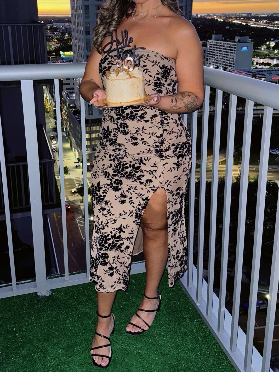 Romance, refined. This strapless mesh midi brings a velvety floral flock and a high side...