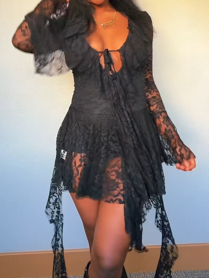 Lace Ribbon Tie Ruffle Bell-Sleeve Romper Dress