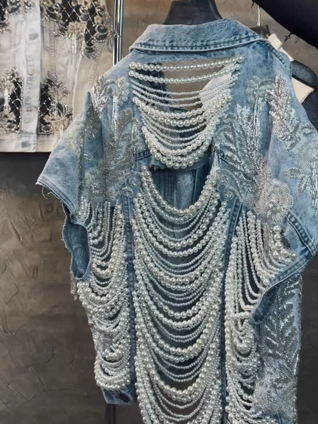 Step into timeless elegance with the Pearl Daze Denim Vest — a vintage-inspired masterpiece adorned...