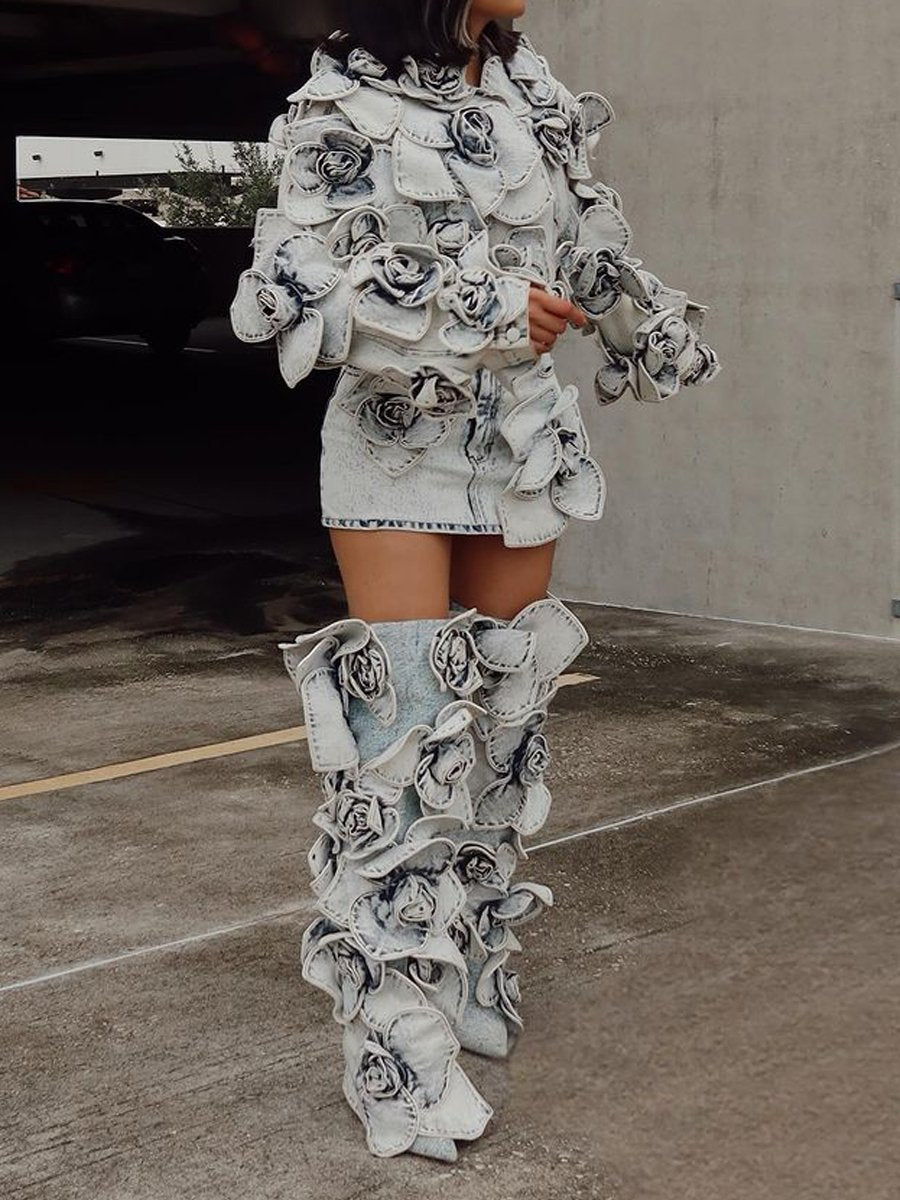-Product Details- Lightweight denim body3-dimensional sewn flower appliqué detailsFunctional belt loops and pocketsHigh-waisted mini skirtModel...