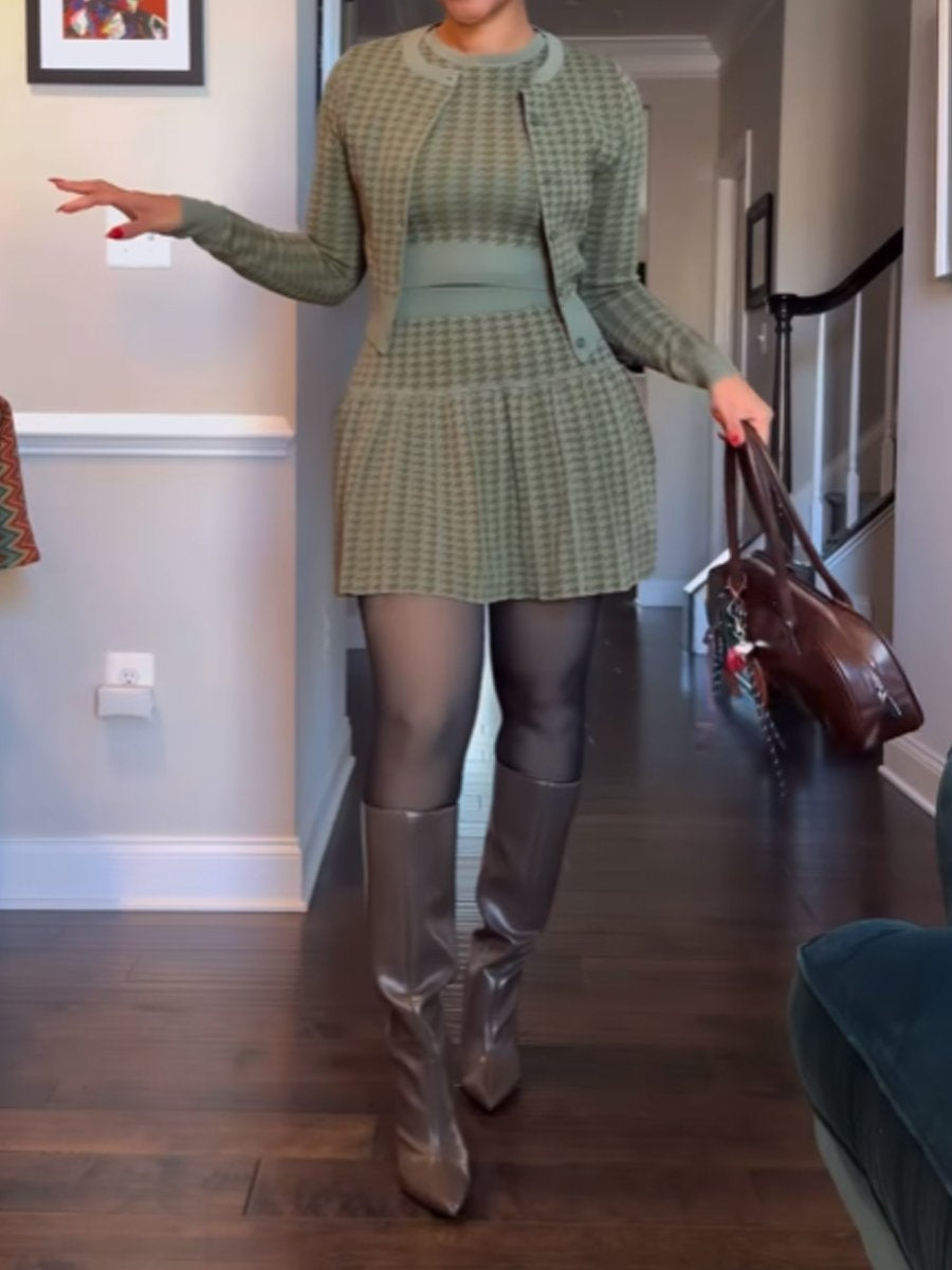 -Product Details- This elegant olive-green 3 piece set features a classic houndstooth pattern with a...