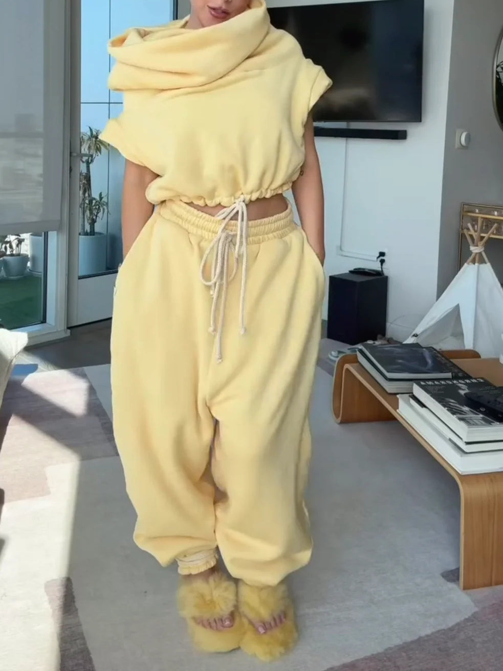 -Product Details- Ultra high cowl, cropped "hoodie" vest. Cotton drawstring at waist and capped sleeves. ...