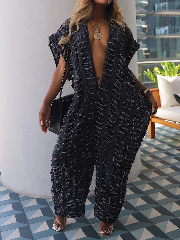 - This is your favorite denim dream cardigan turned into a gorgeous jumpsuit. It has a sexy deep plunge vneck design. It can be worn with a bathing suit underneath or a pop of color bralette.