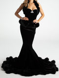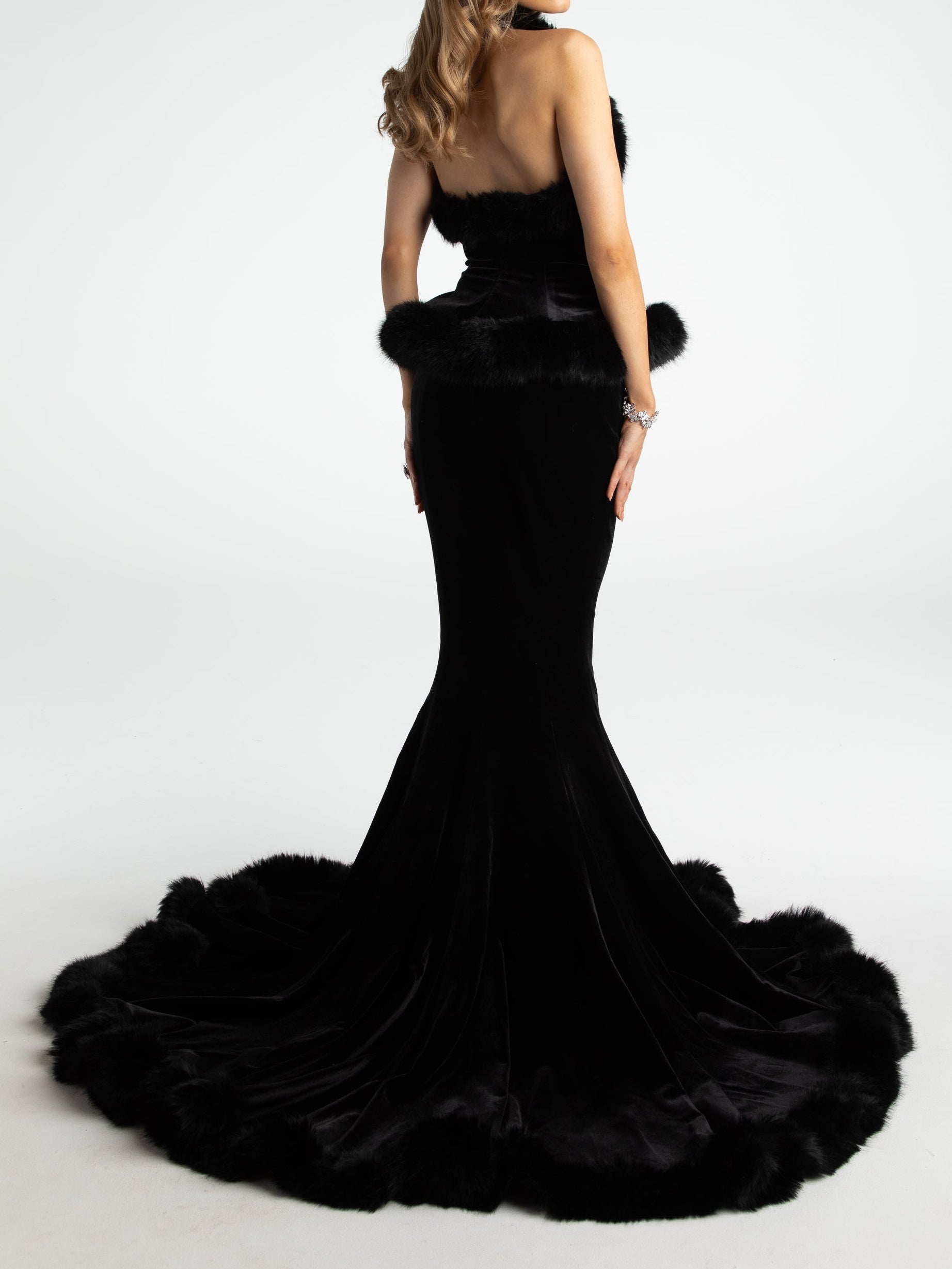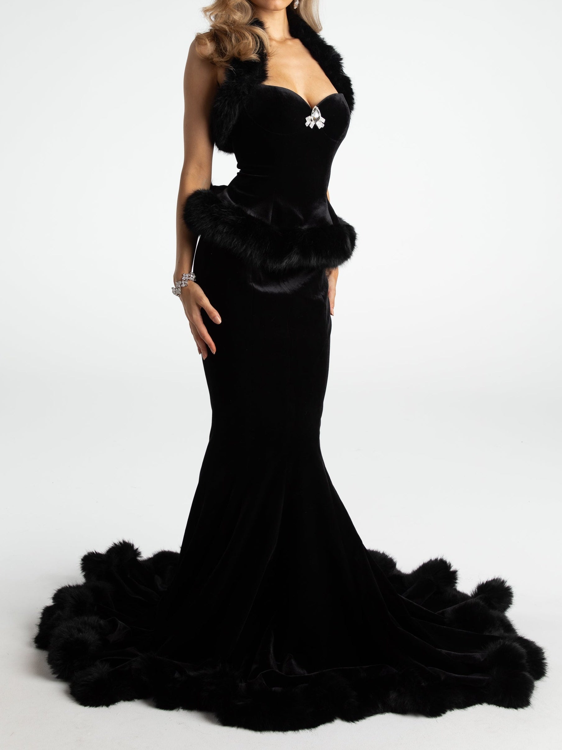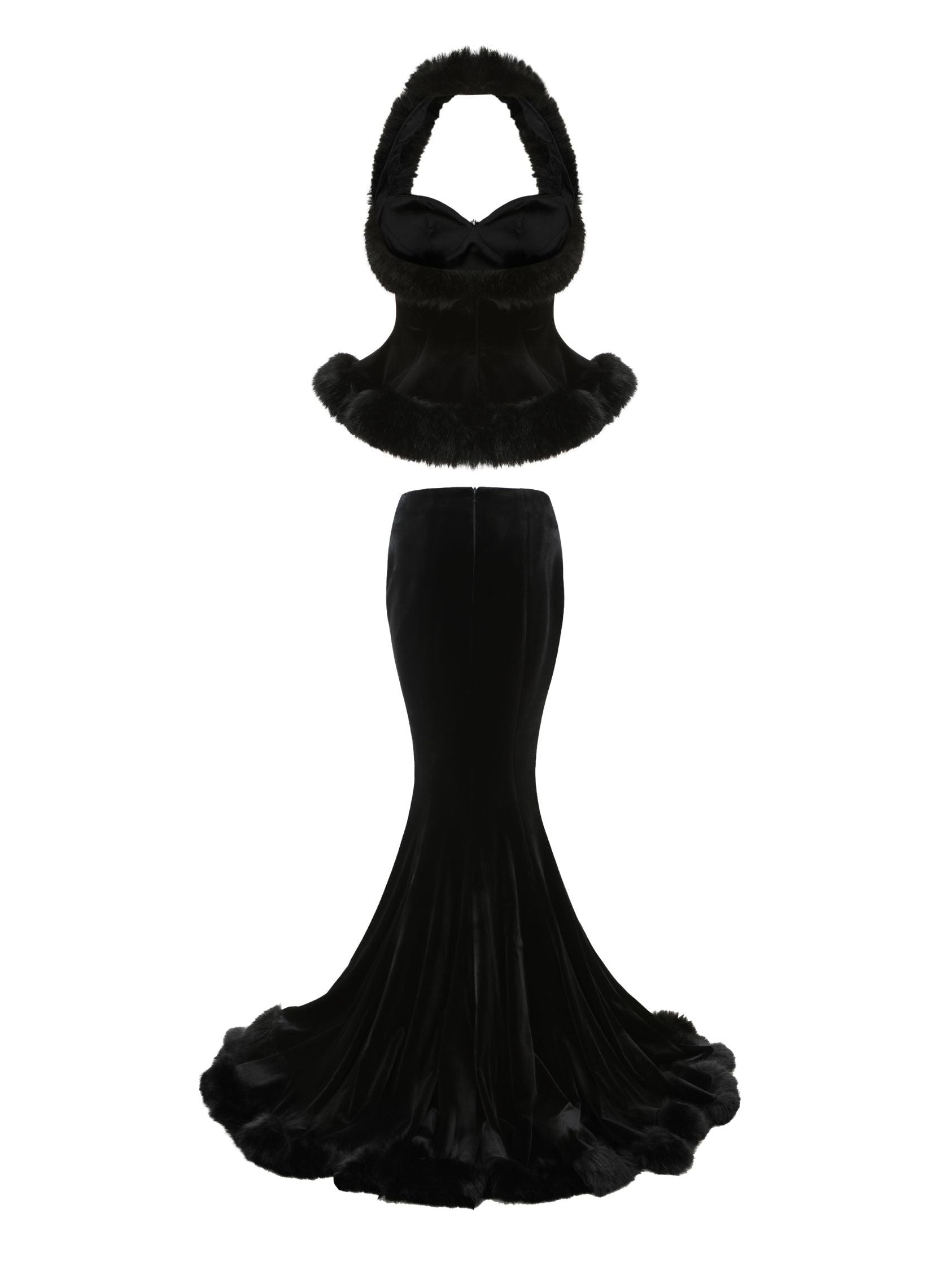 Walk into the season feeling feminine and free in the Christina Velvet Set. This beautiful top and skirt pairing were delicately designed to show off your most flattering curves. Both pieces are made of elastic velvet fabrics to move with you while you dance under the stars. The irregular chest shape is playful while the fur neckline and diamond buckle is oh-so elegant. The fishtail skirt adds a fun flair that complements the top perfectly. Wear them together for a dreamy evening.