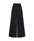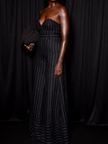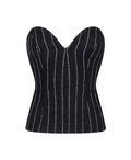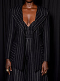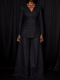 This striking pinstripe suit set is designed for the confident woman who loves to make a statement. Crafted from a high-quality fabric blend, it features a fitted bustier top paired with wide-leg trousers that exude elegance.