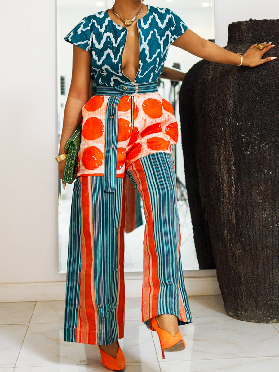 The Jumpsuit is a stunning fusion of tradition and modern style, crafted to honor Nigerian heritage. This unique design blends 2 different soft cotton with handwoven fabric, creating an exclusive combination of three distinct patterns, meticulously crafted to form a one-of-a-kind look.