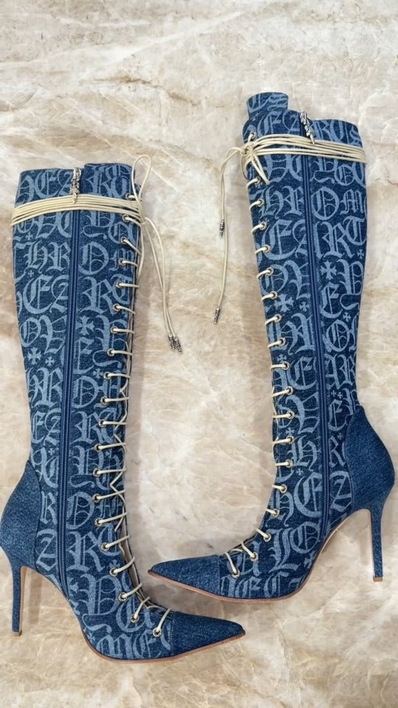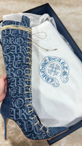 Crafted from premium denim, the boots are adorned with an all-over print of the brand's signature graphic. Featuring a front lace-up design and a sexy stiletto heel, they are a stylish and edgy piece.
