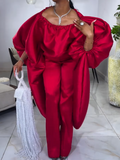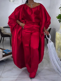 This elegant red two-piece set is the perfect combination of style and comfort. The flowing, oversized top features a flattering silhouette that drapes beautifully, while the sleek, high-waisted pants offer a modern and chic look. Ideal for both casual outings and dressier occasions, this versatile set can easily be dressed up with heels or kept casual with your favorite flats. The rich red color adds a bold, yet sophisticated touch to your wardrobe, making it a must-have for any fashion-forward individual.