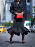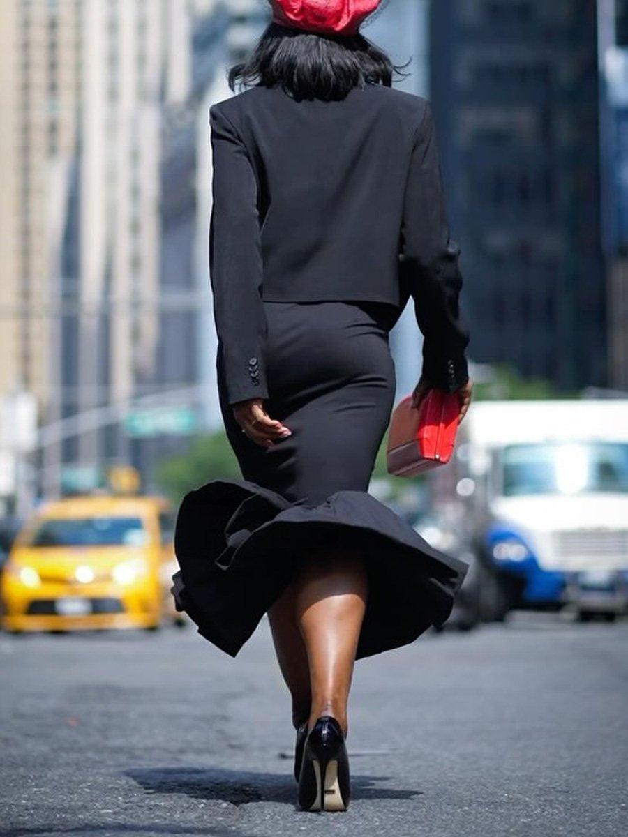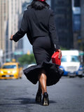 This blazer is cropped and features a lapel neckline. It has a big, removable bow with snap buttons. This blazer features padded shoulders, long sleeves with button details at the cuffs, a button closure and a lining. This blazer comes in black.