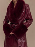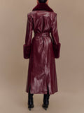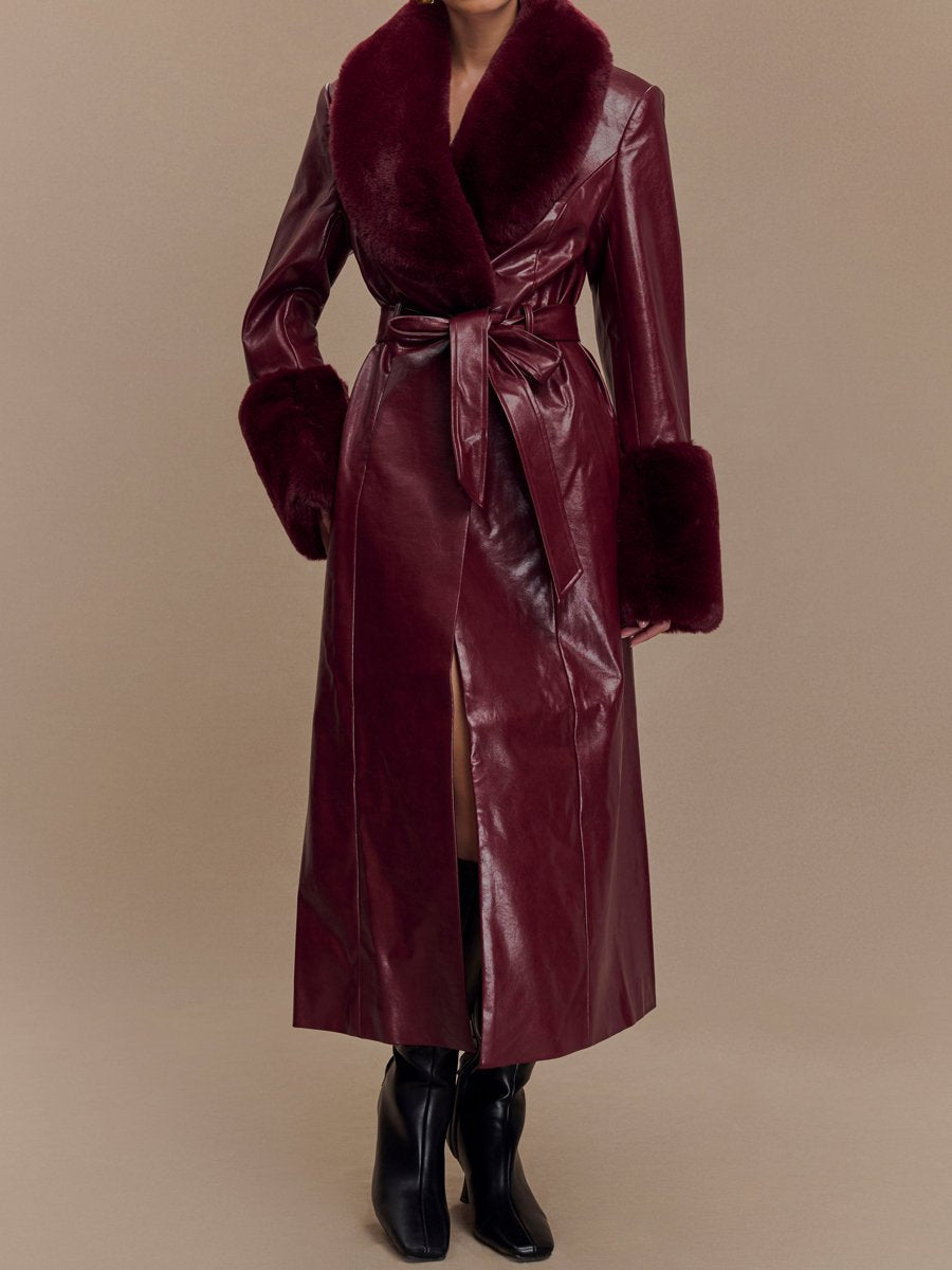 - This longline silhouette features luxurious faux fur trimming on the lapels and sleeves, adding a touch of glamour and warmth. The matching waist belt cinches the waist to accentuate your figure, while functional waist pockets offer both practicality and style. Designed with a centre back split for ease of movement, this coat is crafted from sleek patent PU faux leather for a bold, polished look. Perfect for making a statement while staying cosy, this coat is an essential addition to any wardrobe.