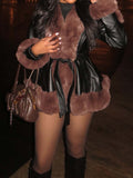The Fur Trim Peplum Moto in Brown features a luxe leather fabrication, plush contrast faux fur trim, a peplum silhouette, and a waist tie belt. Complete with a smooth inner lining and a robe-like design.