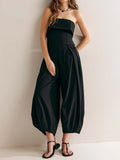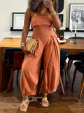 Features: Foldover detail at the bust, back button detailing, pleating at the pants, pull-on design