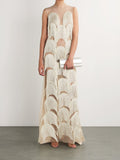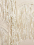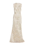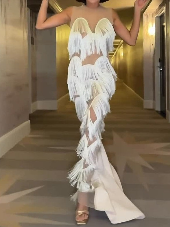 The Fringe Gown is a stunning example of the brand's artistry. This gown features a panel of delicate, sheer mesh with bold fringing in a scalloped pattern. The fringing cascades down the front of the gown, creating a floating effect. The gown is sleeveless and has a round neck. The gown is made of a lightweight fabric and features a back zipper closure.