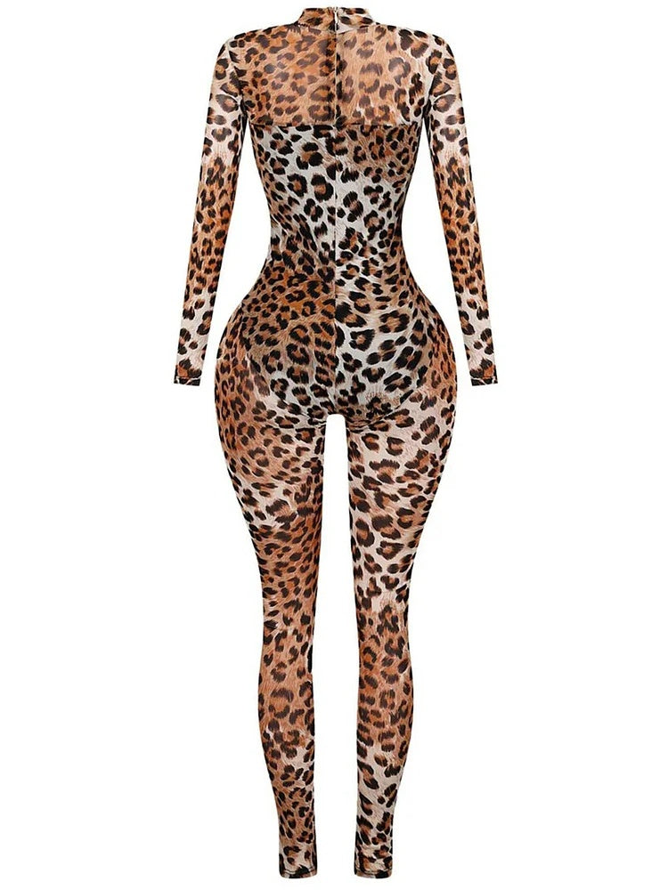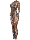 Leopard Print Semi-Sheer Long Sleeve Bodycon Party Jumpsuit