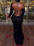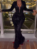 Long Sleeve Embellished Ruched Mesh Maxi Dress