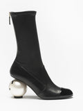 This ankle boot in stretch lambskin and patent calfskin stands tall on an oversized pearl heel finished with a double C.