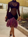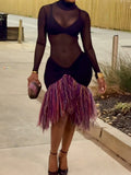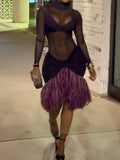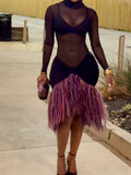 The Sheer Mesh & Fringe Midi Dress is a striking showcase of bold, contemporary design. This dress features a long-sleeve high-neck bodice crafted from sheer black mesh, creating a sleek, see-through silhouette that highlights a minimalist underlayer. The skirt is defined by a voluminous panel of textured purple-and-pink fringing in a dynamic, layered pattern, which sways with movement to create a lively, flowing effect. The dress is constructed from lightweight, stretchy fabrics, with a form-fitting bodice that contrasts with the playful, dimensional fringe.