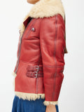The red leather jacket featuring beige shearling lining and collar, silver tone hardware, zip up front, buckle details at waist, two buttoned pockets at chest, and curved hem at front.