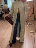 This luxe knit blends cozy comfort with high-shine glamor, crafted from a plush, stretchy metallic-thread fabric. It features a ribbed knit mock neckline, long sleeves, a crossover design in the front, and a floor-length silhouette that drapes effortlessly for a sophisticated look.