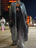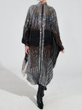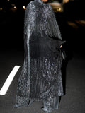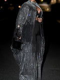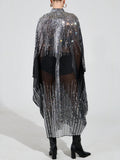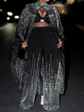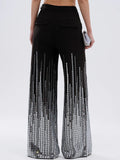 Crafted from a lightweight, sheer nylon fabrication, this glamorous garment features a mock neckline and an oversized, poncho-like silhouette that drapes elegantly over one’s frame. It is adorned with glimmering, mirrored sequins throughout that provide a luxe luster and is complete with a metallic zip front closure. These trousers feature a flattering high-rise, wide-leg silhouette, spacious side slant pockets, rear flap welt pockets, functional belt loops, and a zippered hook and bar front closure. Rows of assorted, vertically aligned, sparkling silver rhinestones stretch from thigh to hem for a fabulously festive finish.