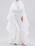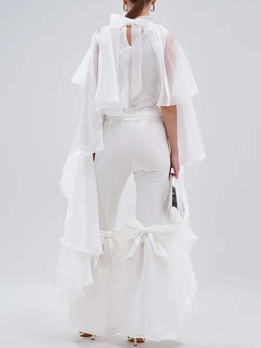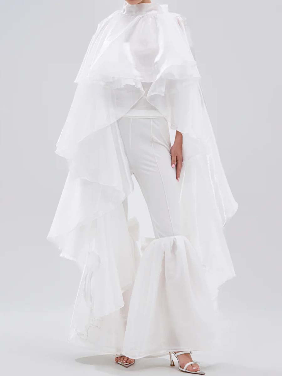 - This stunning top is crafted from a sheer, lightweight satin base and features a mock neckline, a self-tie ribbon closure at the back of the neck, and a dramatic tiered ruffle construction with cascading side pieces that skim the ankles. Complete with an attached stretchy inner cropped tank. Pair with flowy trousers, stilettos, and a bold lip for a ravishing finish.