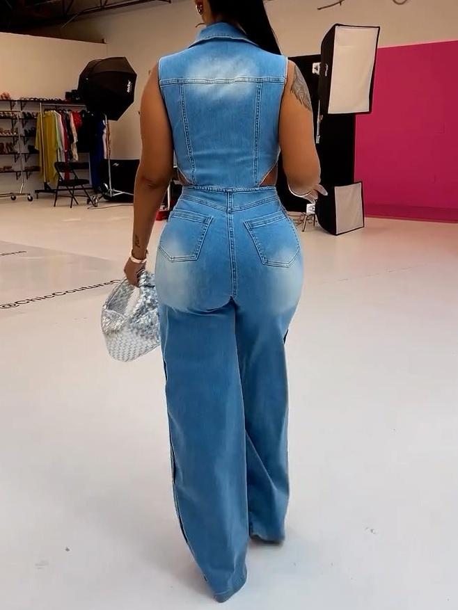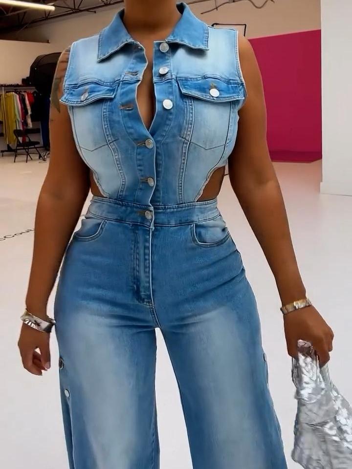 Sleeveless Waist Cutout Denim Button Jumpsuit