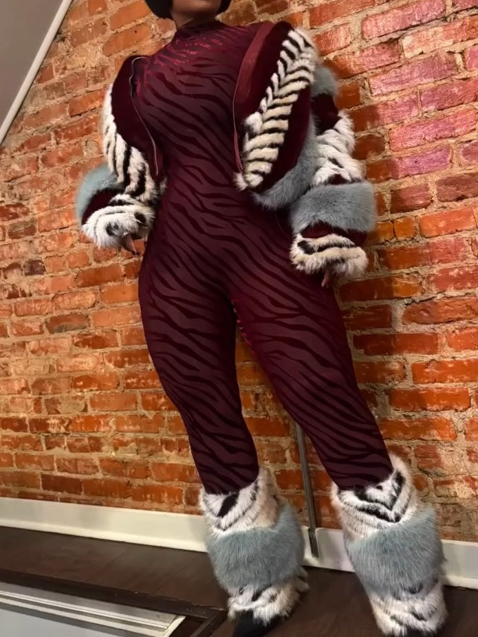 Faux fur fabrication striped print curtain collar neckline long sleeves center front zip closure approx.