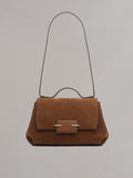 - A sophisticated new flap bag designed for versatility. This structured style is crafted from soft suede and punctuated by sleek metal bars. Top handles allow you to carry it by hand or over your shoulder, while the back patch pocket offers quick access to cards.