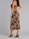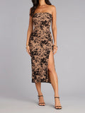 Romance, refined. This strapless mesh midi brings a velvety floral flock and a high side slit that keeps the elegance balanced with just the right amount of sultry, perfect for dressy occasions.