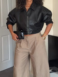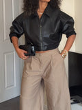 Vegan leather. Collared neckline. Zip front. Balloon hem. Side pockets. Ribbed sleeves.
